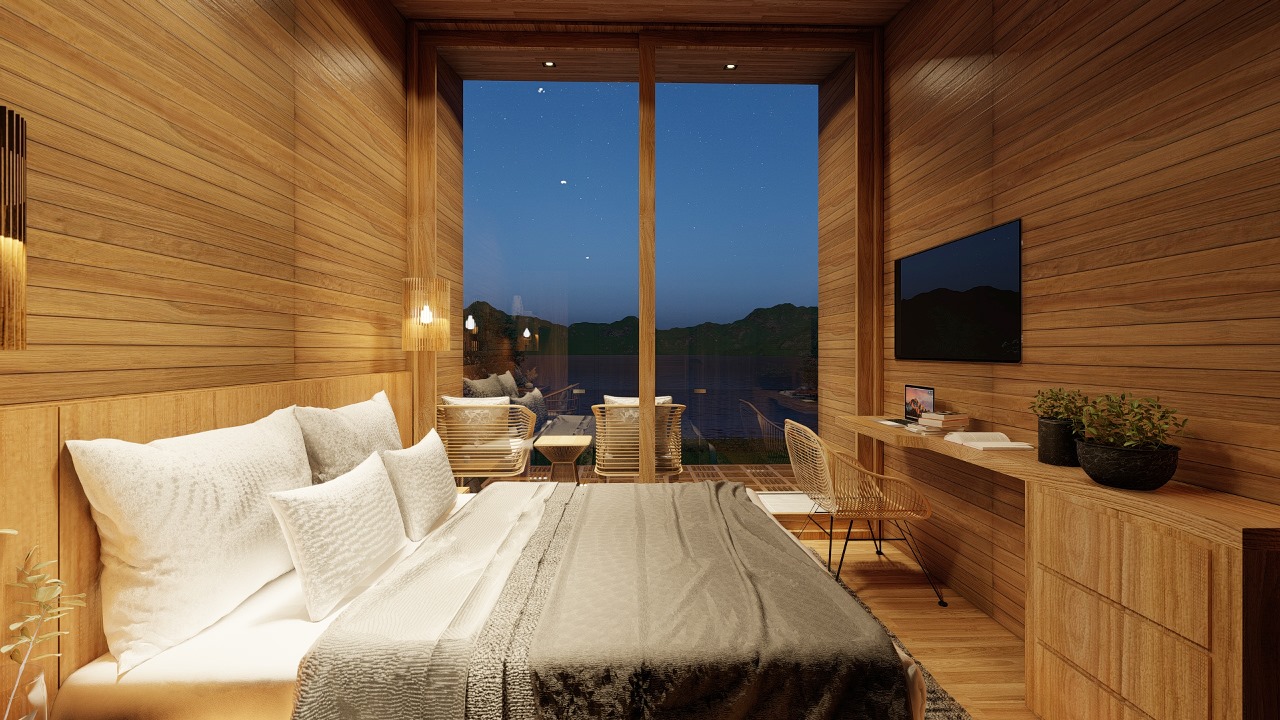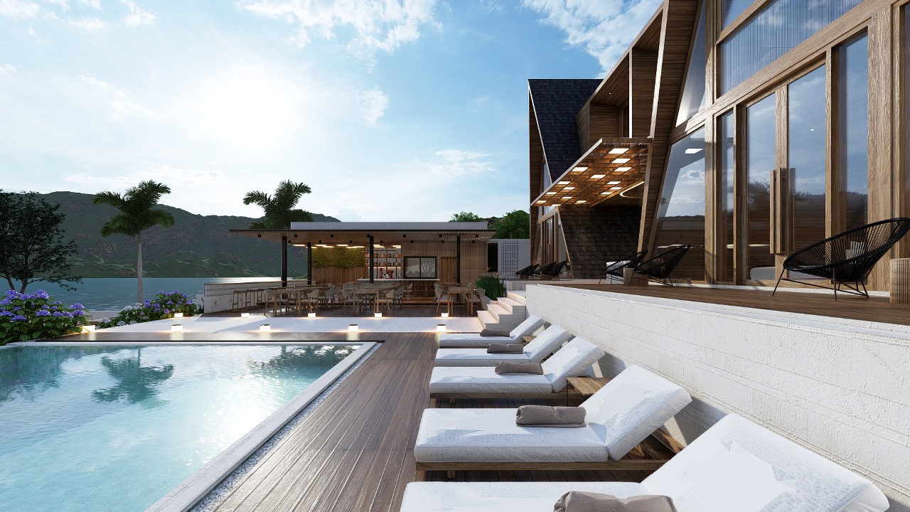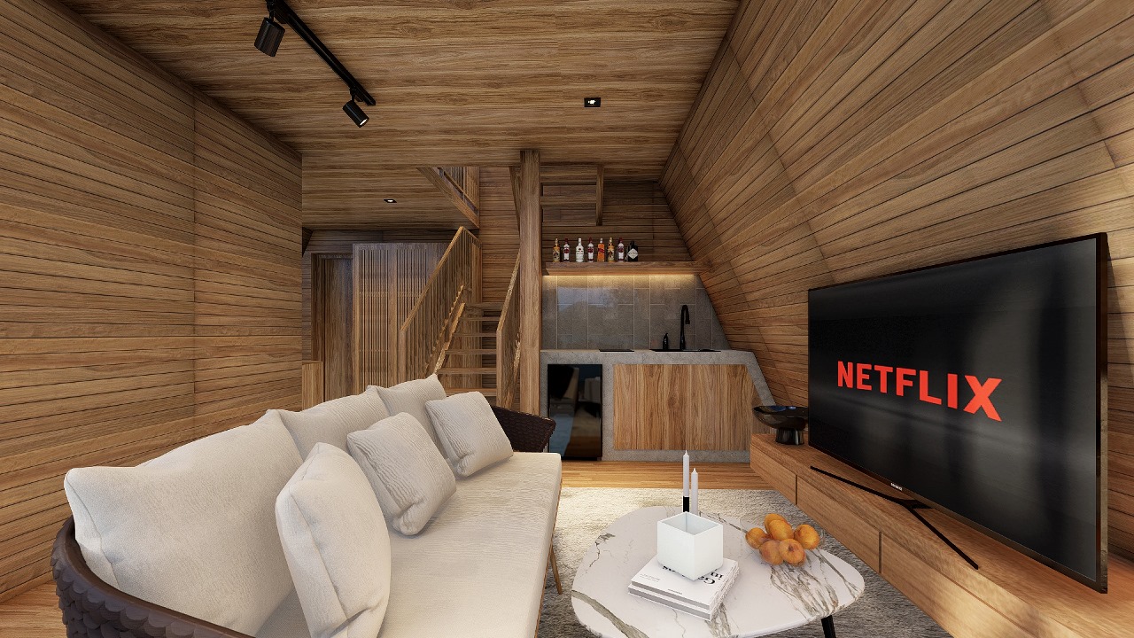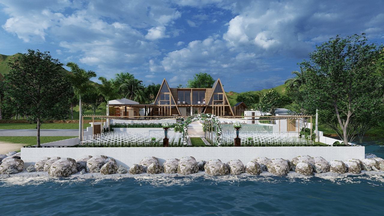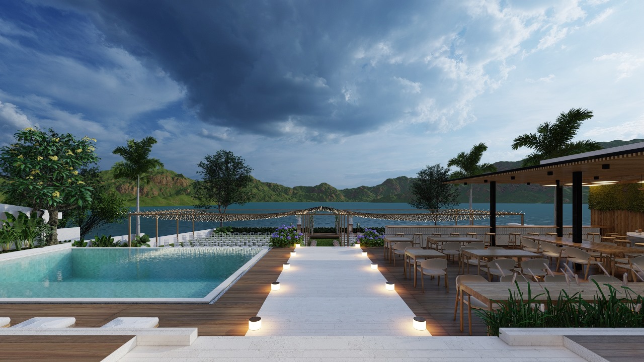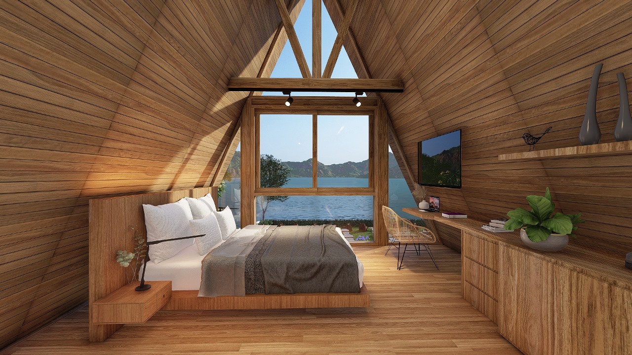 The design theme and concept used is cabin wood with an architecture that predominantly uses wood with a triangular shape which is the symbol of this building. In this area we also provide public pool facilities, a restaurant and an open garden area which can be used for wedding events with a view towards the lake.