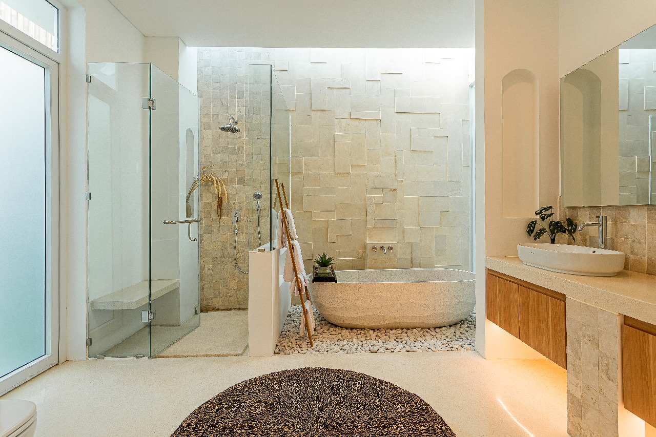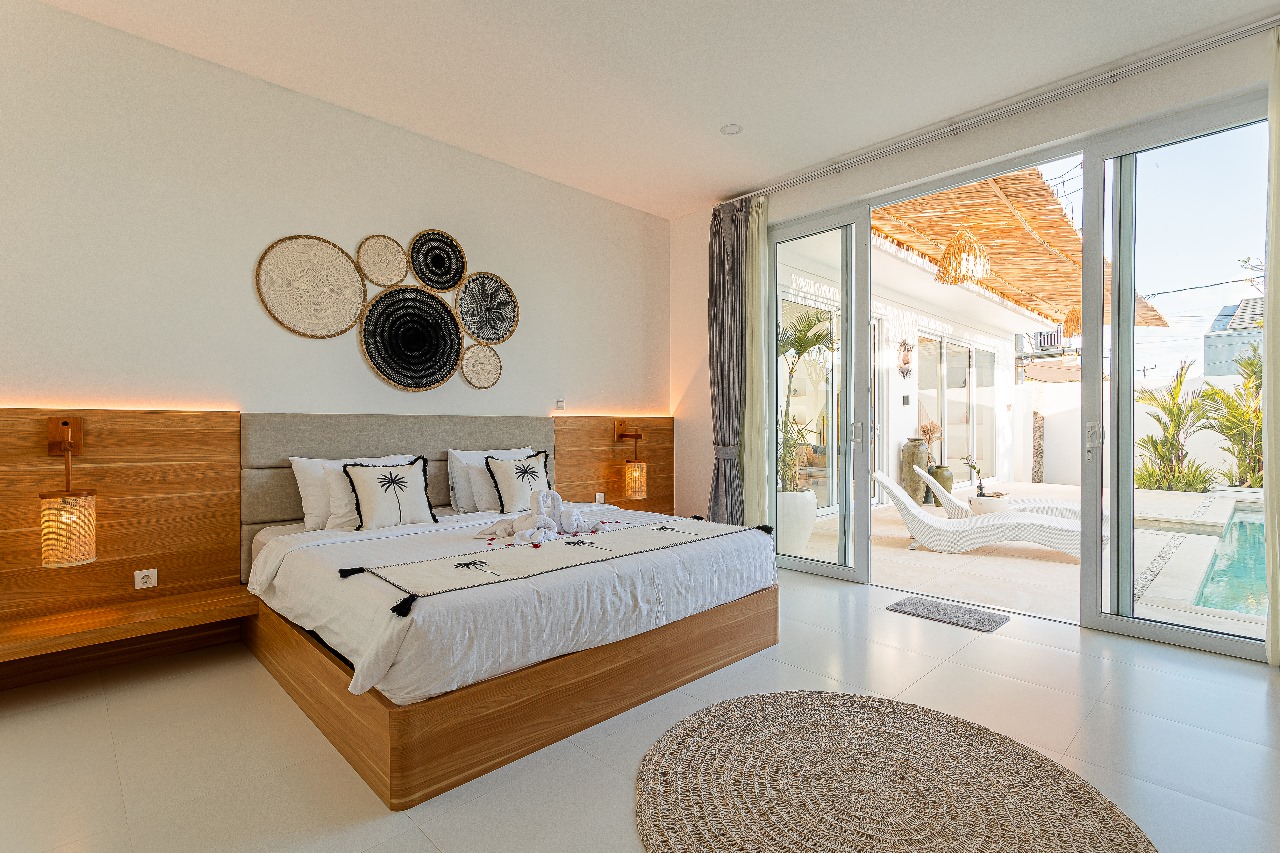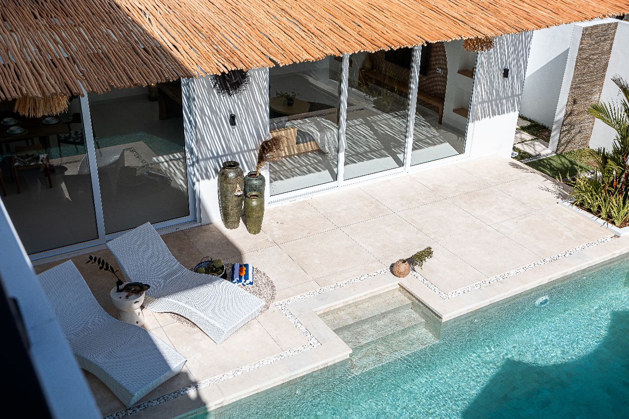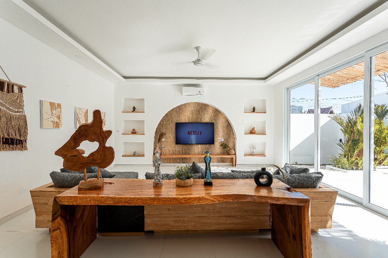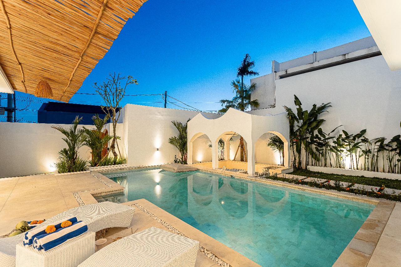 This villa was designed with a Mexican white Mediterranean design concept and theme, so the entire villa is designed with a full white theme with several arch elements giving a unique, attractive, simple impression. This villa has a private pool with sunken lounge facilities which provide additional value in the villa’s communal area.
